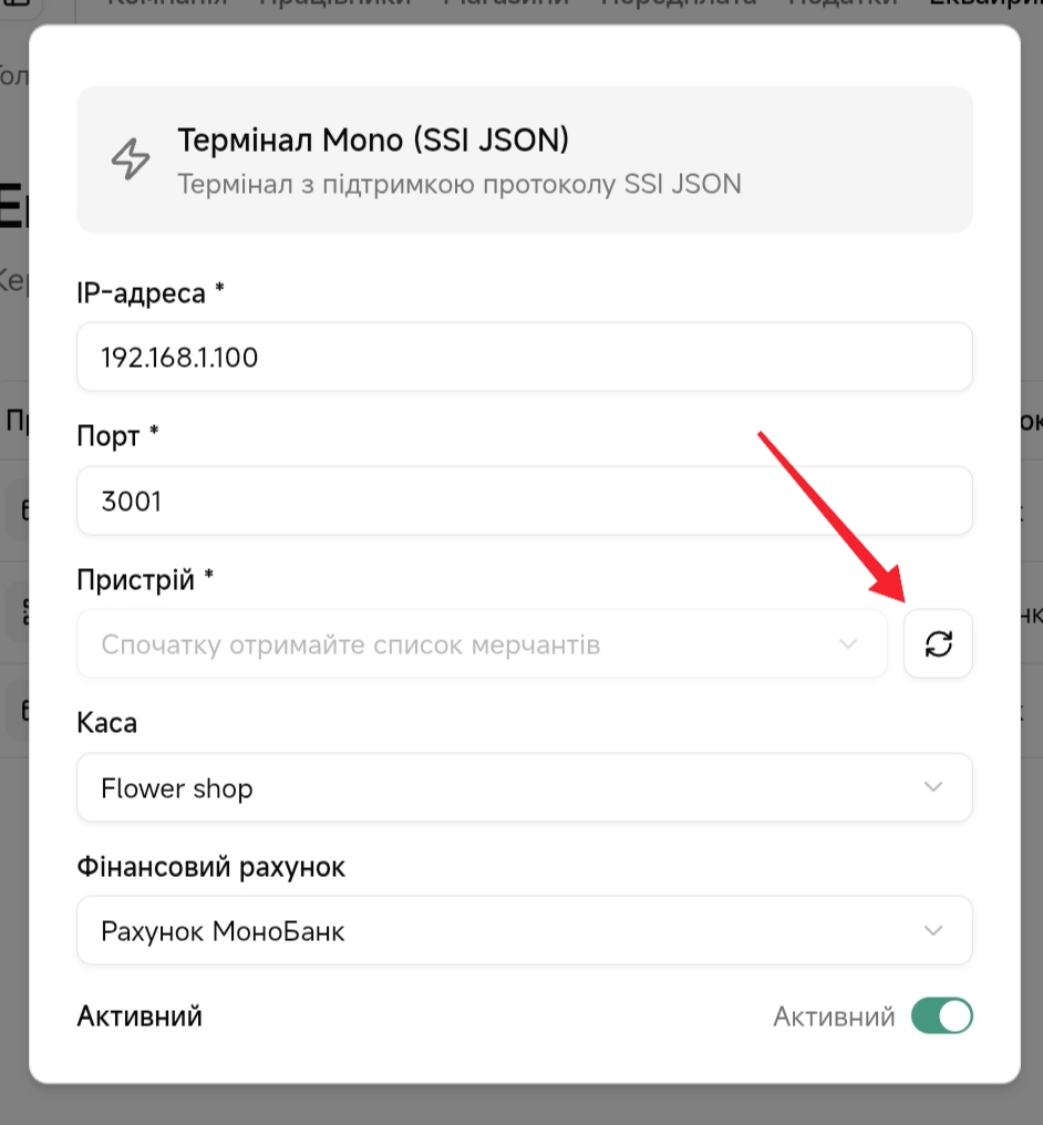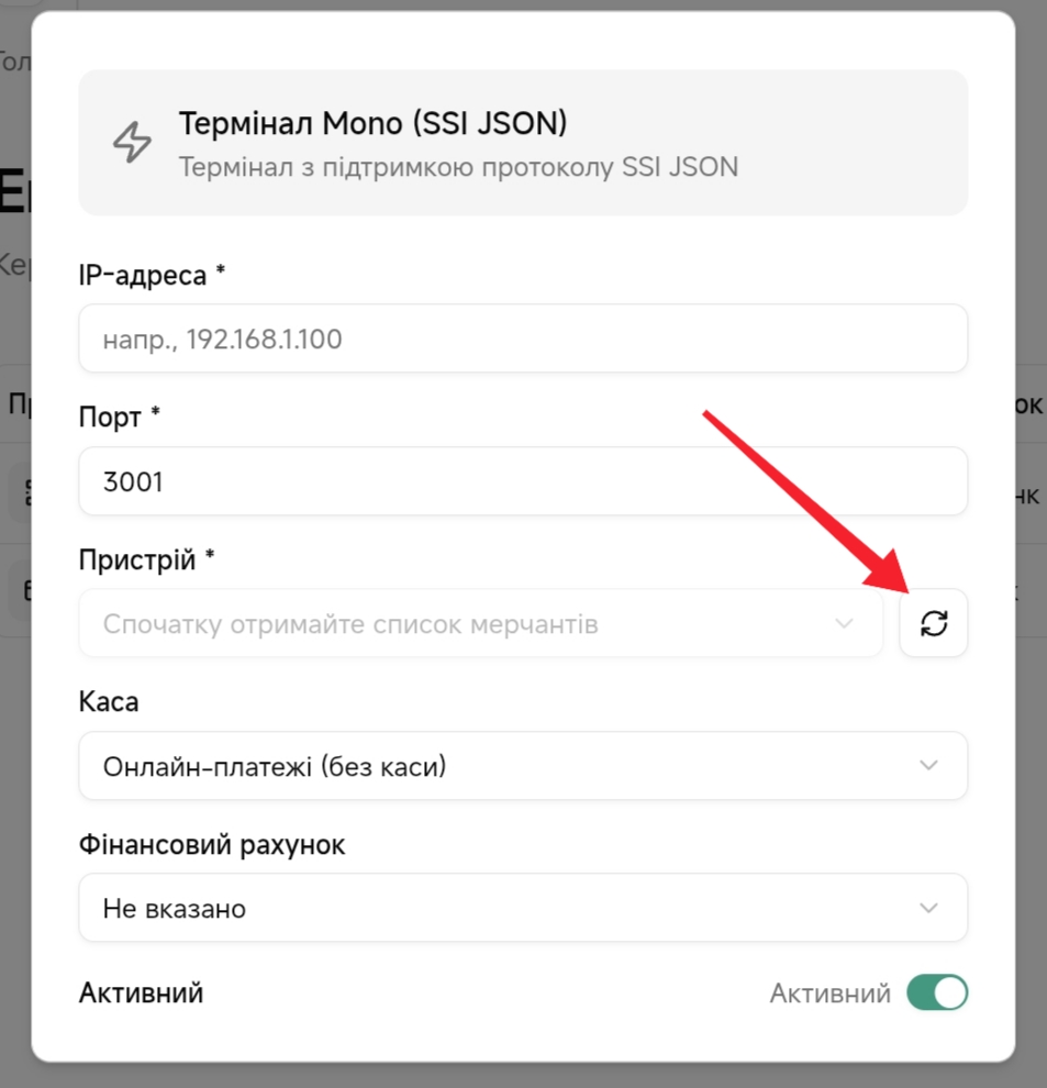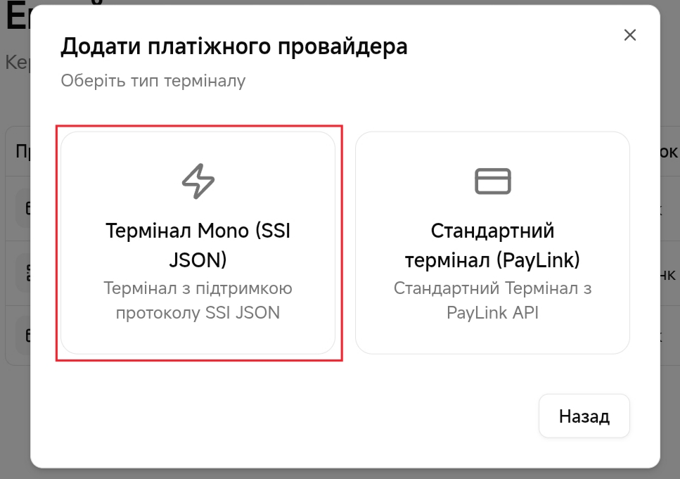 - У вікні що відкриється оберіть Банківський термінал. Оберіть тип терміналу Протокол SSI JSON