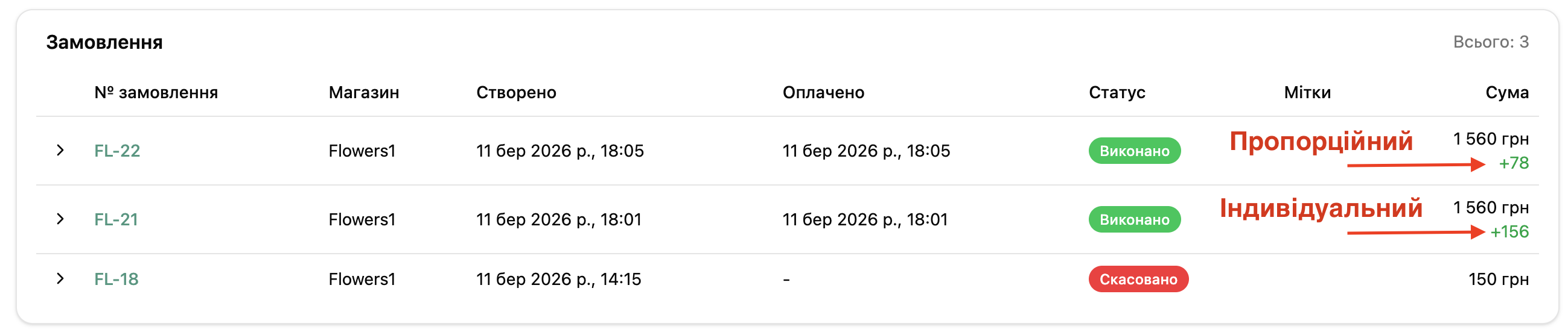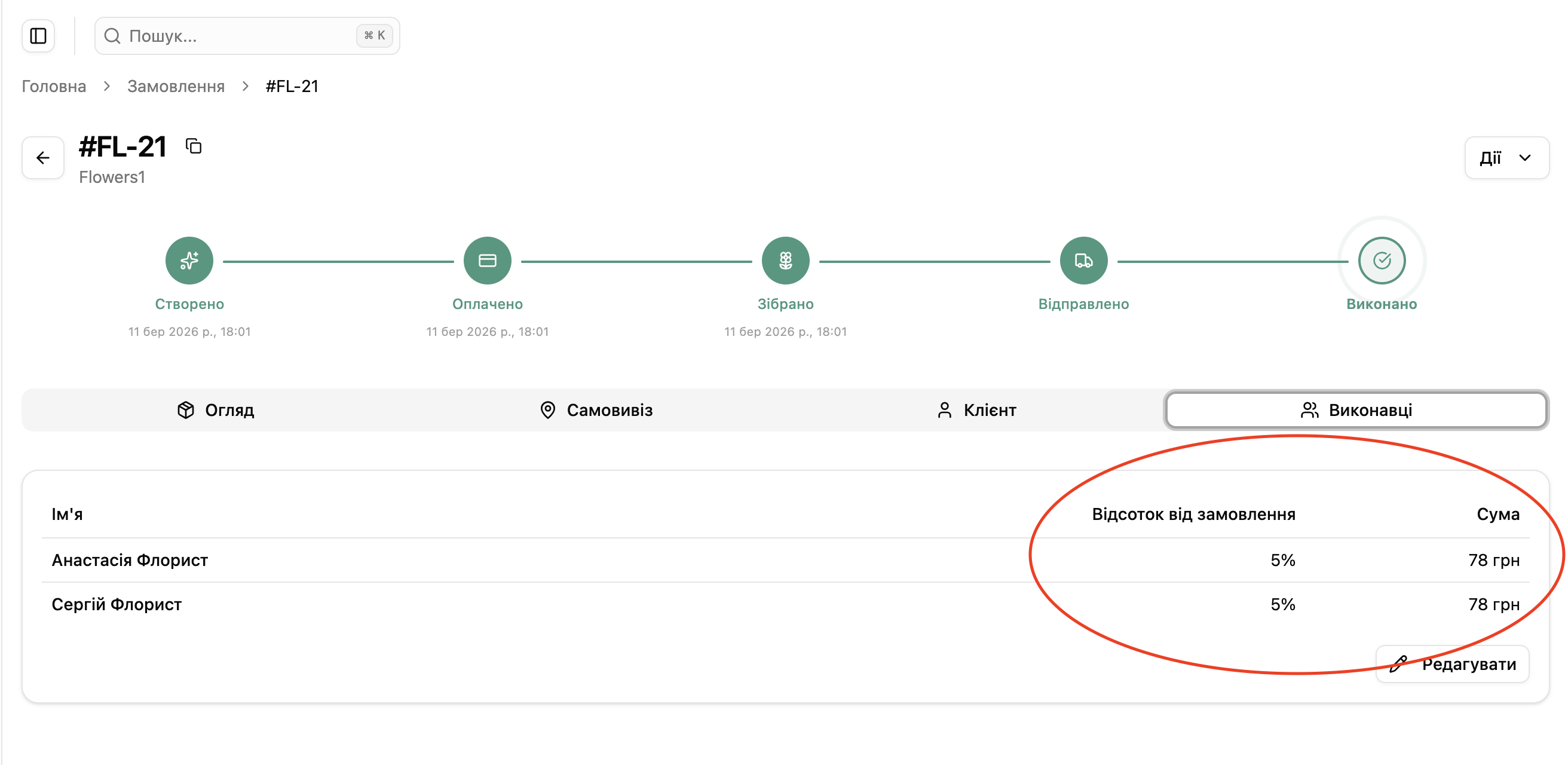 Наприклад, маємо замовлення на 1560 грн, у цьому замовленні є два виконавця: флорист Сергій за яким закріплено бонус від замовлення 5% і флористка Анастасія за якою закріплено 5% від замовлення.